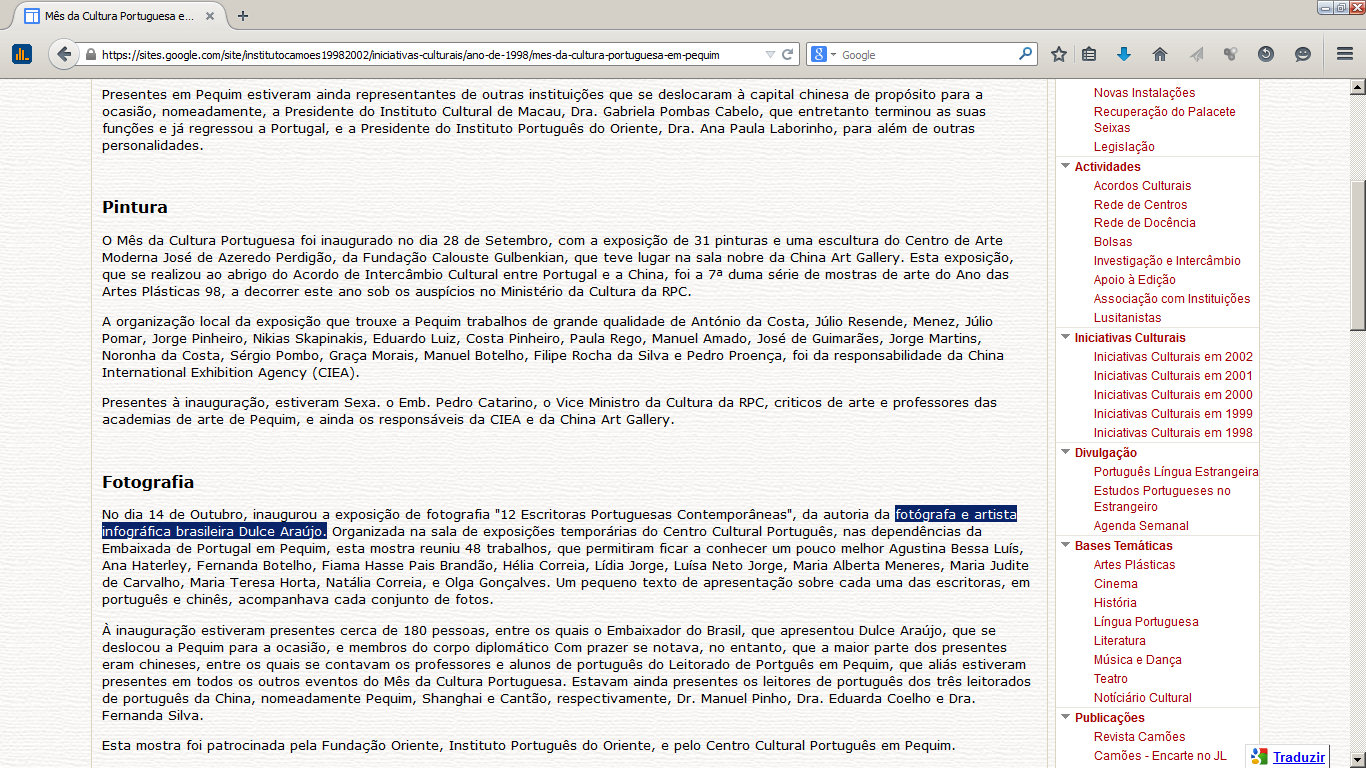 Exposição “12 Escritoras Portuguesas Contemporâneas” 14 de outubro de 200726 de fevereiro de 2015Dulce Reis Instituto Camões/Reprodução Compartilhe isso:TweetCompartilhar no Tumblr Clique para imprimir(abre em nova janela) Imprimir Clique para enviar um link por e-mail para um amigo(abre em nova janela) E-mail Curtir Carregando...