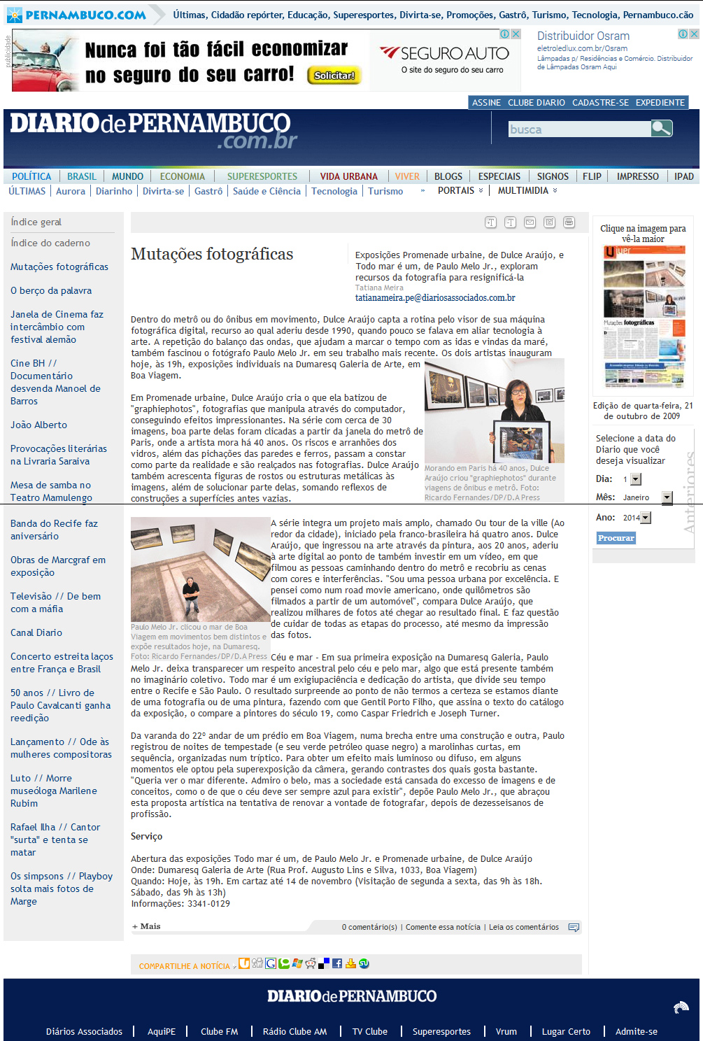 Clipping com as principais matérias sobre a exposição “Promenade Urbaine” da artista plástica Dulce Araújo. A mostra aconteceu na Dumaresq Galeria de Arte, no Recife, em 2009.