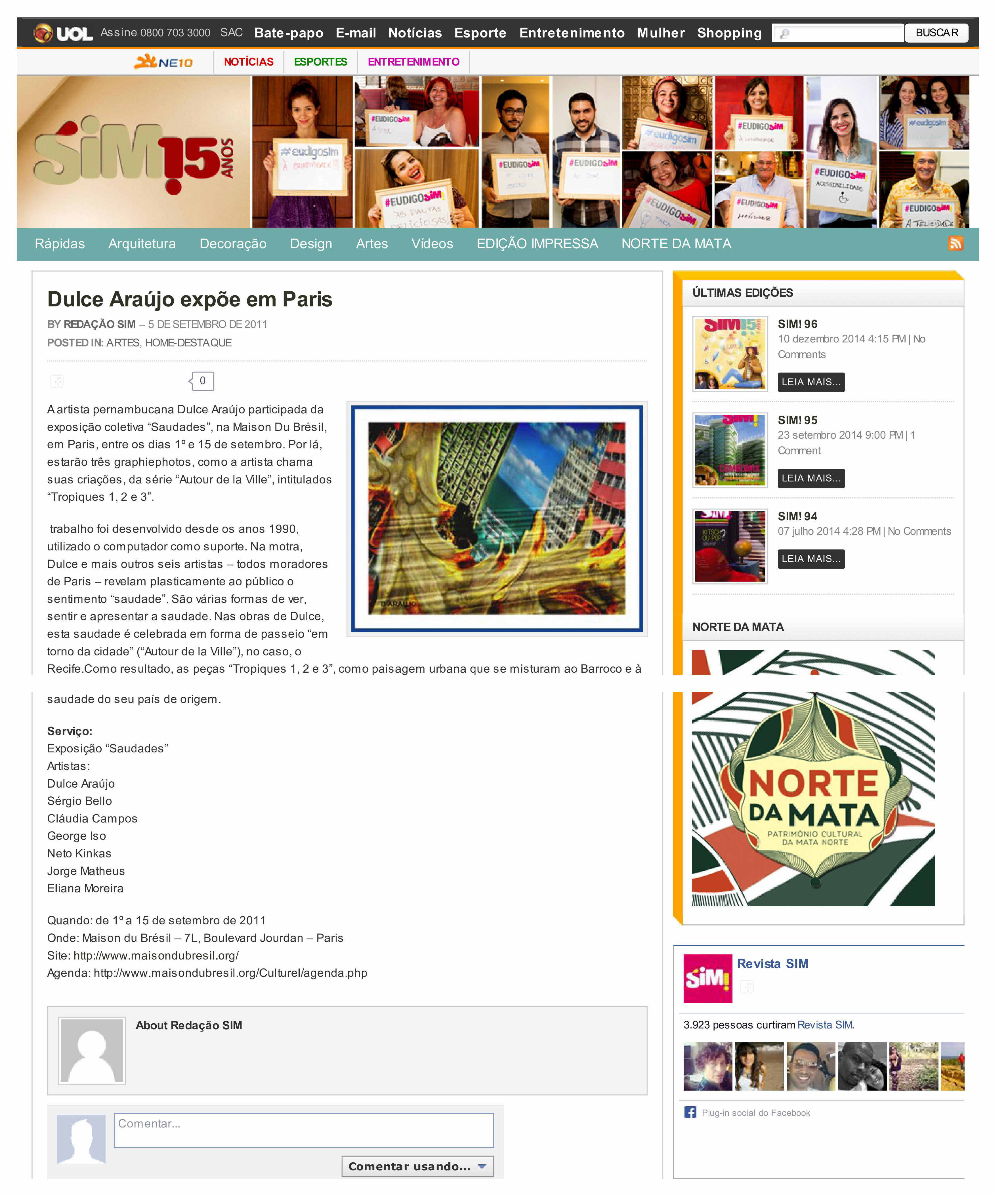 Revista Sim: Dulce Araujo expõe em Paris 5 de setembro de 201118 de fevereiro de 2015Dulce Reis Saiba mais: http://revistasim.ne10.uol.com.br/2011/09/2189/ Compartilhe isso:TweetCompartilhar no Tumblr Clique para imprimir(abre em nova janela) Imprimir Clique para enviar um link por e-mail para um amigo(abre em nova janela) E-mail Curtir Carregando...